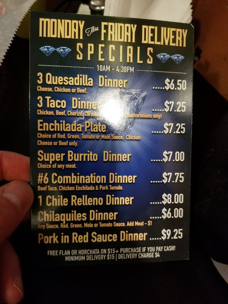 Favorites like al pastor tacos, the steak burrito, and the flautas dinner provide satisfying options for those craving familiar Mexican staples. For something lighter or perfect alongside a drink, grab some tortilla chips with queso dip or a refreshing margarita, making it easy to unwind in the welcoming, laid-back atmosphere.